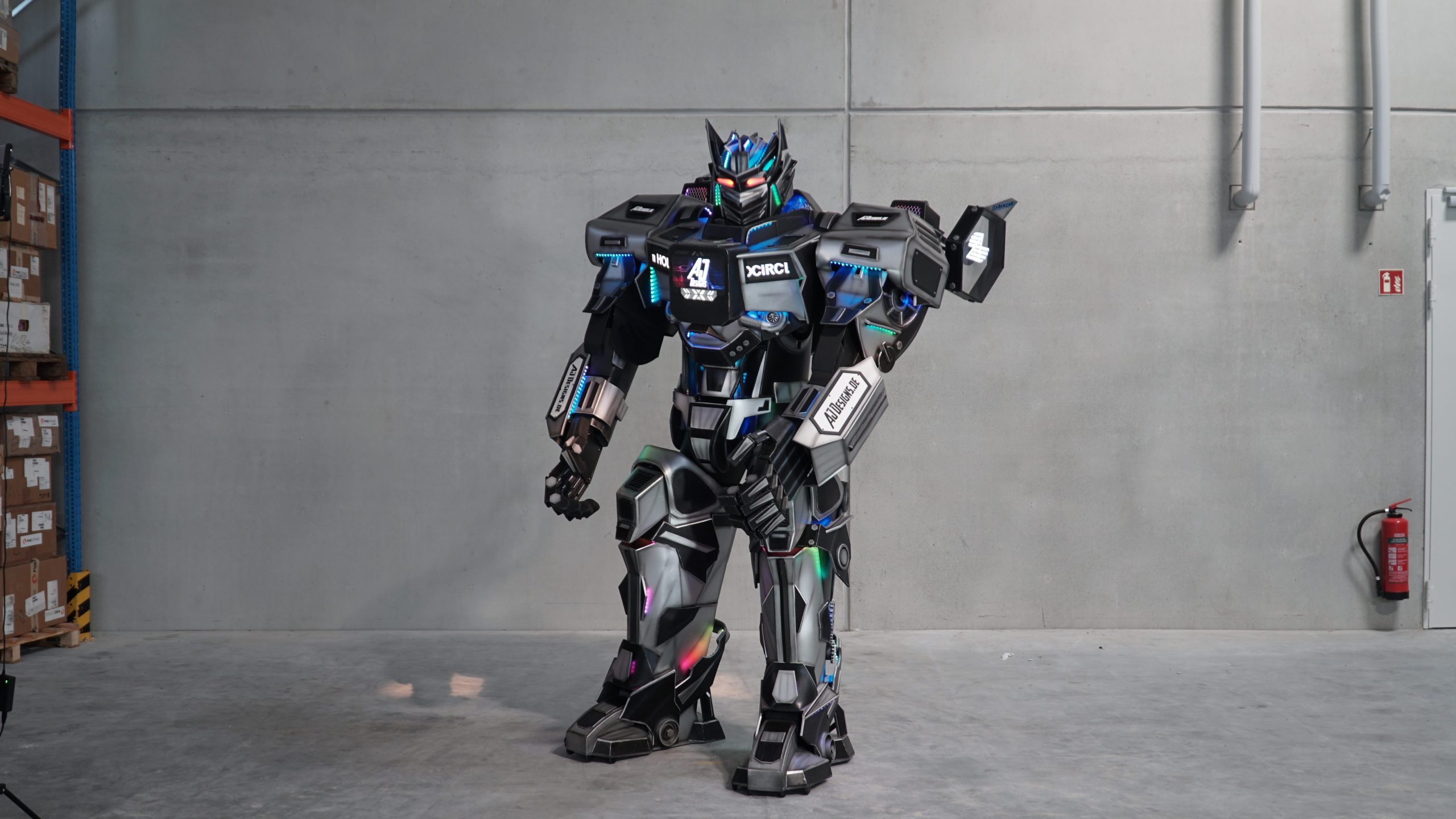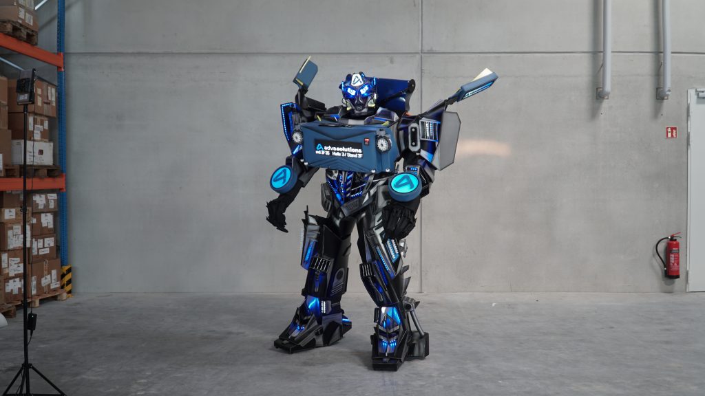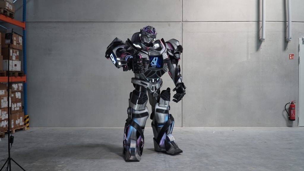 Highlight sind die integrierten Displays auf Brust und Armen: Das zentrale HD-Monitor-Display kann Imagefilme abspielen, die seitlichen Displays eignen sich perfekt für Firmenlogos. Zusätzlich sorgen ca. 1000 individuell steuerbare LEDs für beeindruckende Lichtinszenierungen in den Markenfarben des Kunden.