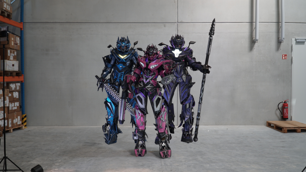 Unsere drei Lady Bots tragen klangvolle Namen, die ihre Persönlichkeit und Präsenz unterstreichen: Elystra (Lila), Atheena (Pink) und Streetblade (Blau). Inspiriert von den Transformers-Filmen und aufgebaut wie unser Klassiker „Bluestripe“, vereinen sie futuristisches Design mit technischer Raffinesse. Mit einer Höhe von 220 cm und 600 integrierten LED-Leuchtmitteln sorgen sie bei jedem Auftritt für maximale Sichtbarkeit.